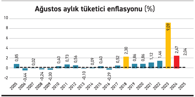 Bu hafta açıklanan ağustos ayı enflasyon rakamları, Merkez Bankası açısından oldukça olumsuz bir tabloyu ortaya koydu. Ağustosta aylık enflasyon yüzde 2 ile, 2005’ten bu yana olağanüstü kur şoklarının yaşandığı 2018 ve 2023 yılları hariç, en yüksek ikinci aylık enflasyon oranı olarak tarihe geçti. Kıyaslama yapmak gerekirse 2005-15 döneminde aylık enflasyon ortalamada yüzde 0,2 ile bu yılki aylık enflasyonun onda biri kadardı.